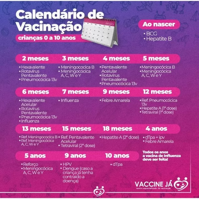 ➡️ Confira no calendário acima as vacinas indicadas mês a mês do nascimento até os 10 anos. Lembrando que este é o calendário do PARTICULAR.